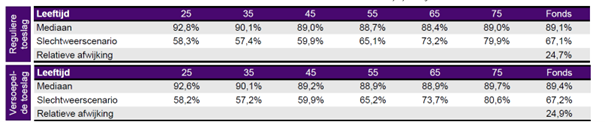 We hebben de effecten op het verwachte pensioenresultaat bekeken voor verwachte toekomstscenario's (mediaan) en voor scenario's waarin het minder goed gaat met de economie (slechtweerscenario's). In onderstaande tabel staan de percentages die horen bij verschillende leeftijden.