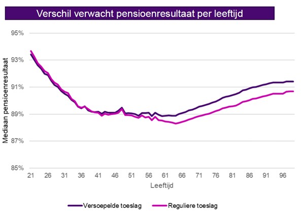 - De jongere deelnemers die nog pensioen opbouwen, hebben minder voordeel van deze verhoging dan de oudere deelnemers en de mensen die al pensioen ontvangen. Jongere deelnemers hebben tot nu toe minder pensioen opgebouwd dan wanneer er op een later moment een verhoging zou zijn. Hierdoor is de invloed van de extra verhoging nu minder groot. Bij deelnemers tot circa 40 jaar is een lichte daling in verwacht pensioenresultaat te zien.
